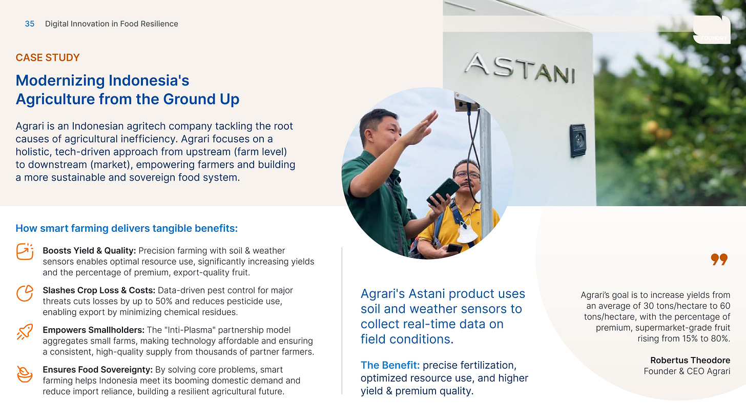Agrari, a homegrown agritech company, demonstrates how smart farming directly tackles agricultural inefficiency. Using its Astani product with soil and weather sensors to collect real-time field data, Agrari achieves measurable results: higher yields, up to 50% reduction in crop losses through data-driven pest control, and empowerment of smallholder farmers through its Inti-Plasma partnership model. This end-to-end approach (from farm level to market) creates a more sustainable and self-sufficient food system while minimizing chemical residues for export compliance.