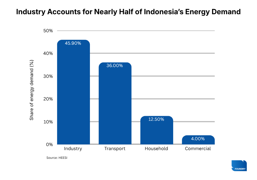 Contrary to public discourse that often focuses on the residential sector, data indicates that the industrial sector is the primary engine of change. Industry consumes nearly half of Indonesia’s total energy demand, offering a scale where efficiency gains compound far more rapidly than at the household level. Taken together, these dynamics point to a shift in where and how Indonesia’s energy transition is likely to take shape.