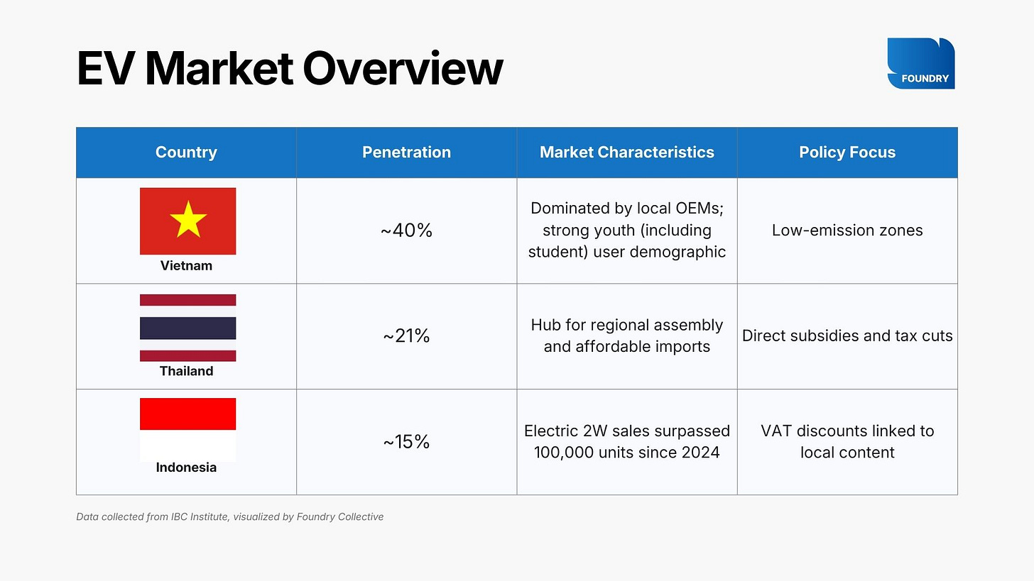 The regional context sharpens the picture. Southeast Asia is advancing past legacy automotive markets in EV adoption, and the composition of that growth varies considerably across markets.