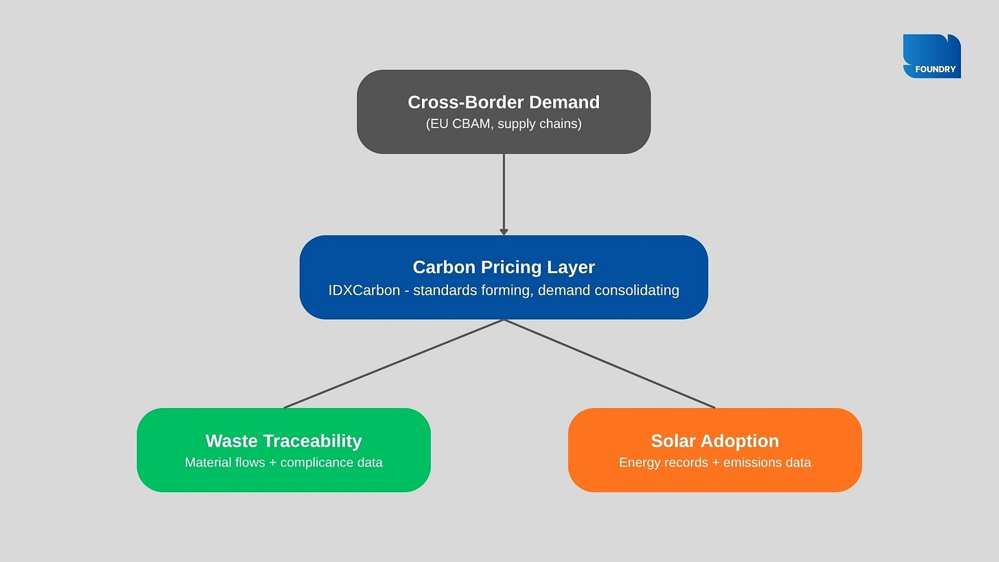 What is emerging is a set of interconnected activities, each generating the inputs the next layer requires. Waste generates material flows and compliance data. Solar adoption generates measurable energy use and emissions baselines. From this, emissions can be calculated. As demand develops, carbon becomes the pricing layer that connects them.